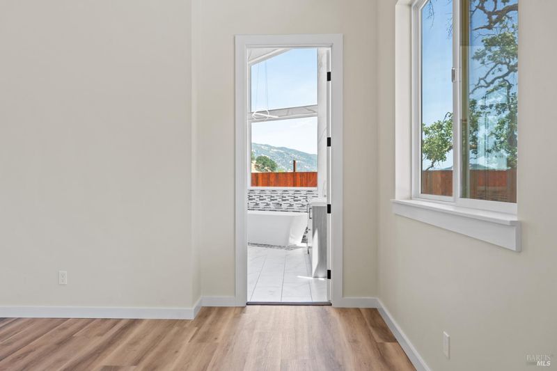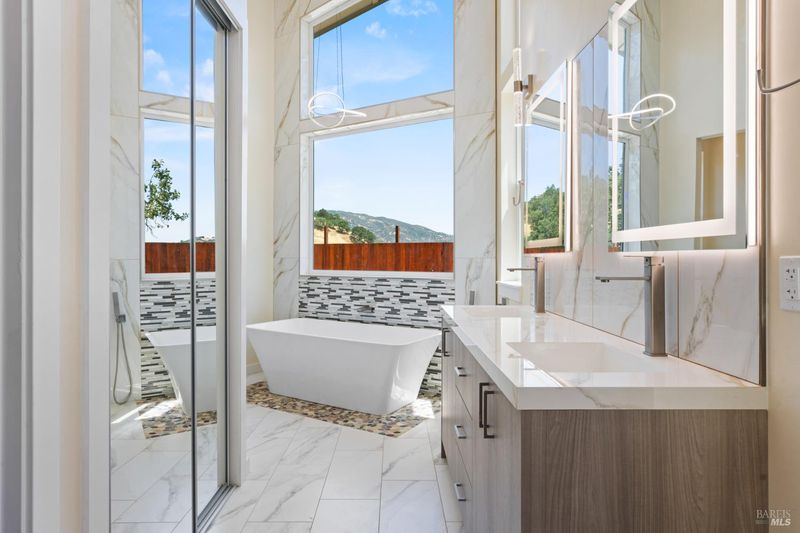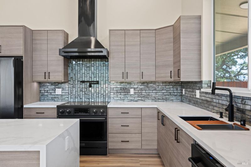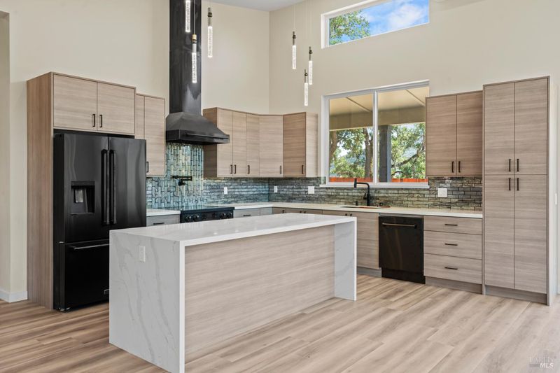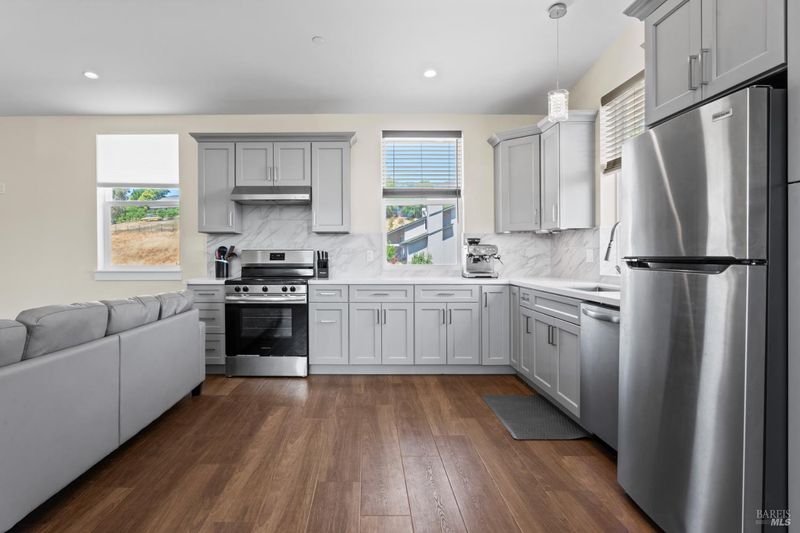 Discover this brand new modern wine country estate with attached second home and sweeping panoramic views. Main house features 2800 sq ft, 4 bedroom, 3 bath custom home with open floor plan and private paved road, 2 primary suites, large vaulted window, 14 ft cathedral ceiling, custom closets, heated floors and luxurious oversized soaking tub in primary bathroom. The chef's kitchen is equipped with Gordon Ramsay electric range, pot filler, wine fridge, large bar area with secondary prep sink, quartz waterfall countertops, a cozy electric fireplace and striking glass tile. The 72 foot covered back porch overlooks the beautiful views of vineyards, ponds and valley floor below. Above the three car garage sits a 2 bed 1 bath, 1200 sq ft second residence with full-size kitchen, spacious floor plan, custom cabinets and quartz countertops, large primary bedroom with tall windows, walk-in closet and separate one car Garage with private entry. Great for guest or as income producing rental. This 6 acre property includes public water, private Septic, extensive fencing for privacy, lifetime metal roof, passive solar design, large solar system, room for infinity pool or small hobby vineyard. all just minutes from 101. Come enjoy the views from this marvelously built wine country charm.