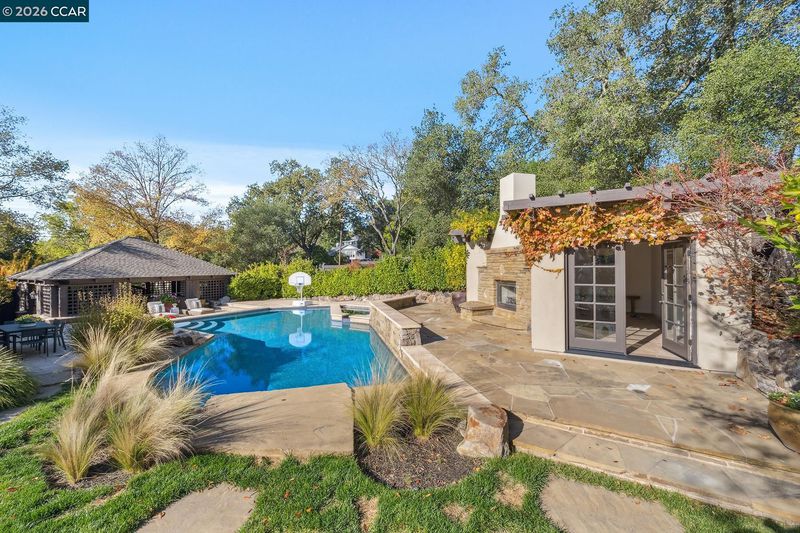 Welcome home to this Trail neighborhood retreat. Re-built by renowned builder Jeff Momsen and refreshed in 2025 by Emerson Grace Design, this single-level home blends California charm with modern updates. Step inside to find open-concept living where French doors flood rooms with light and open onto multiple outdoor spaces. The chef's kitchen features custom cabinetry, beautiful countertops, artisan backsplash, and premium appliances. Hip banquette seating invites lingering coffees while the family room keeps everyone connected. An oversized bonus room with pool access is perfect for movie nights. Custom closets, refreshed bathrooms, and two fireplaces with honed marble surrounds add elegance throughout. Outside, the upgraded saltwater pool and spa, built-in grill, generous patios, and pristine lawn create your private resort. The charming cabana offers endless possibilities—office, studio, sanctuary. Steps from Lafayette-Moraga Trail, minutes from downtown boutiques and restaurants, close to Waln