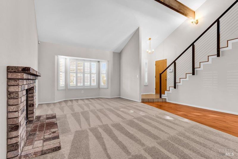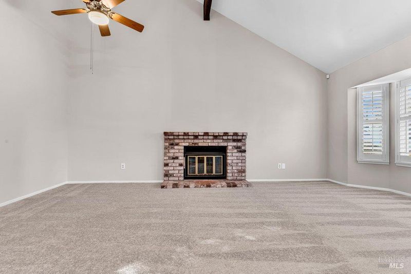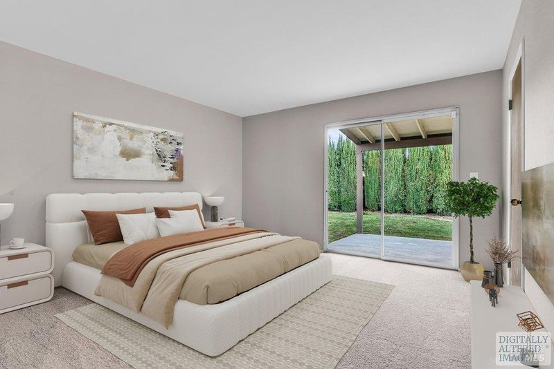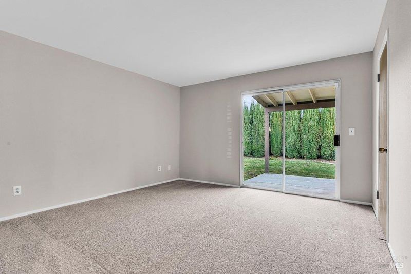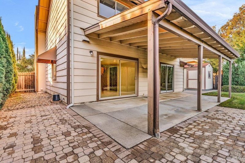 Two-story 3BD/2BA California Contemporary home with Tuscan-inspired backyard located in Vacaville's established Jepson Estates neighborhood. Offering approx. 1,437 Sq Ft of living space, this home features a functional floor plan with well-defined indoor and outdoor areas and a private courtyard-style backyard. A defined entry opens to a combined living and dining room with vaulted ceilings and a fireplace, creating a bright central gathering space with good separation from the kitchen while maintaining visual connection and flow. The rear-positioned kitchen offers ample cabinetry, generous counter space, skylights for natural light, and a sliding door that opens directly to the backyard, supporting easy indoor-outdoor living. The main level includes a private bedroom suitable for use as a primary suite, with direct backyard access, providing flexibility for owners, guests, or multigenerational living. Two additional bedrooms serviced by a 2nd full bath are located upstairs off a central hall, both separated from the main living areas below and well suited for family bedrooms, guest rooms, or home office use. Additional features include an attached 2-car garage with space for storage or hobbies, a dedicated laundry closet in the kitchen, and a freestanding storage shed. The backyard offers a piazza-style hardscape with cobblestone-pattern pavers and a wall of Italian cypress, creating a private and structured outdoor setting suitable for gardening, pets, play, or entertaining. Conveniently located near parks, shopping, dining, and I-80 commuter access.