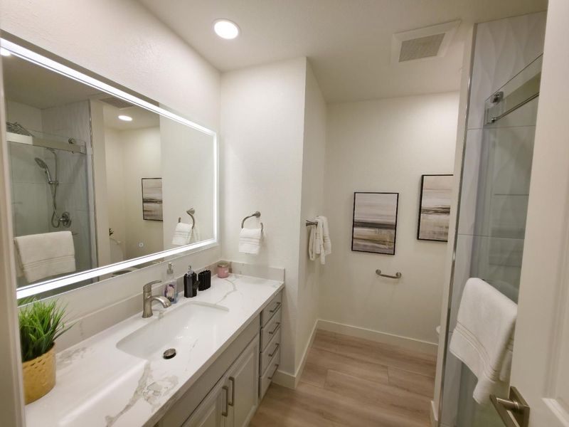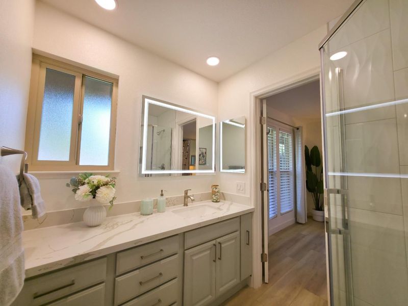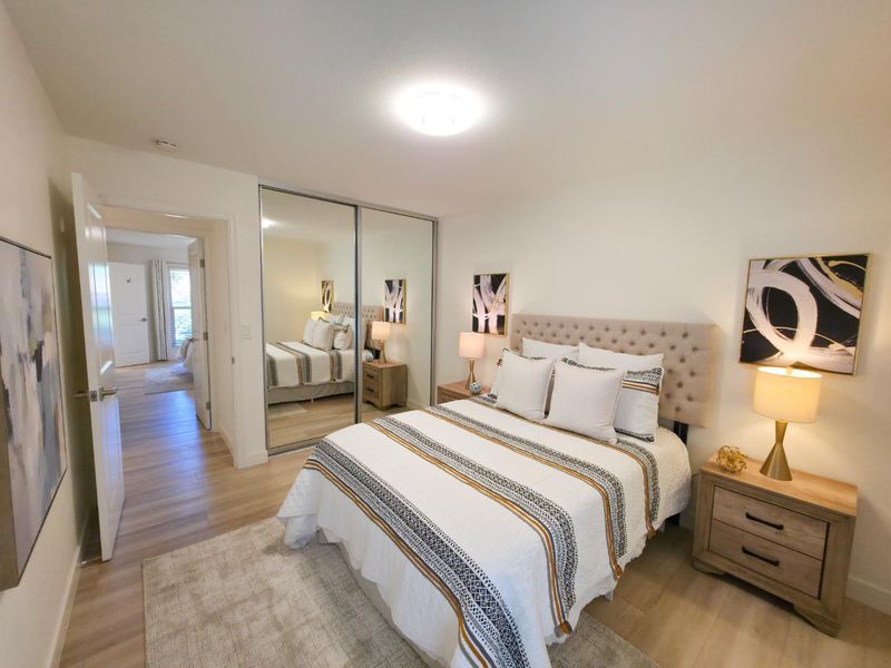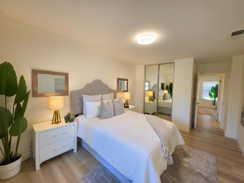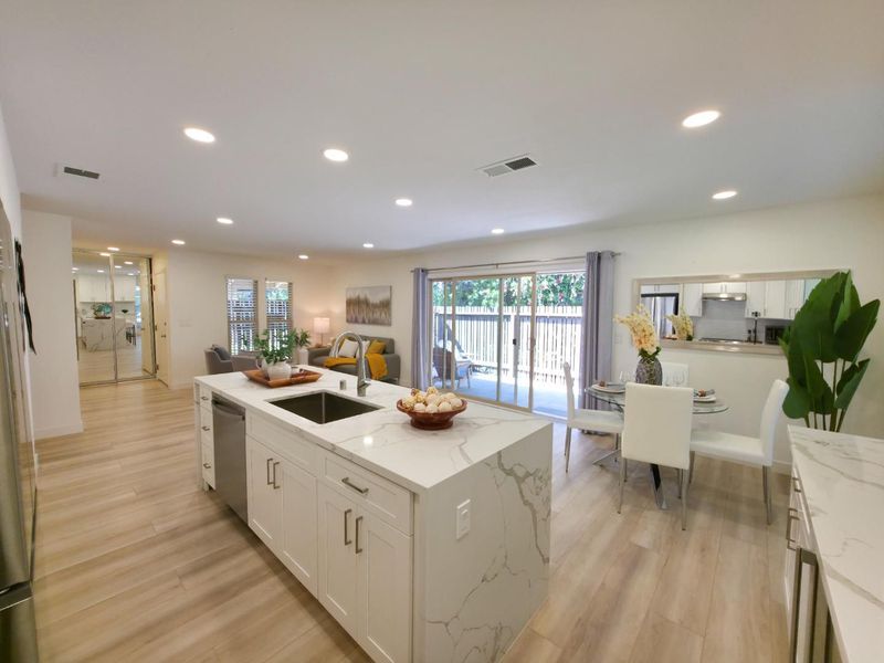 Commuters' dream home! This fully remodeled 3BR/2BA single-story end-unit home in the heart of Sunnyvale combines modern style with everyday convenience. The open-concept great room provides generous space for dining and entertaining, seamlessly extending to a large private patio through an extra-wide sliding door. The sleek kitchen showcases quartz countertops with a waterfall island, stainless steel appliances, a wine chiller, and abundant cabinetry. The primary suite offers a walk-in closet and an ensuite bathroom with a bidet, while additional upgrades include lighted mirrors, in-unit laundry, central A/C, luxury vinyl plank flooring, recessed lights, and modern finishes throughout. Nestled in one of the communitys best locations, the home is surrounded by mature trees and landscaped lawns. Short commutes to major tech employers like Nvidia, Apple, Google, Meta and more. Amenities include an updated clubhouse, a sparkling pool, lush greenery, and tall shade trees. Close to Costco, Whole Foods, shopping, dining, with easy access to Hwy 101/237, Central and Lawrence Expressways, and Caltrain.