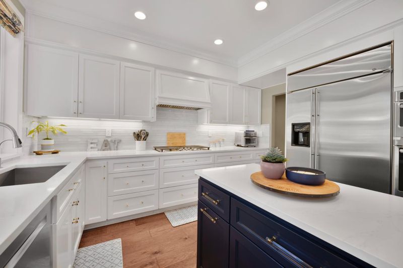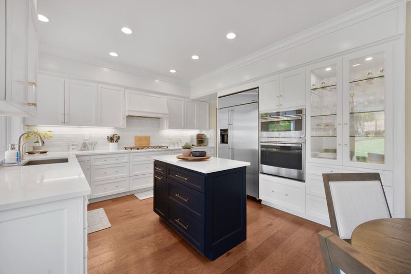 - 220 Volt Outlet, Cooktop - Gas, Countertop - Quartz, Dishwasher, Exhaust Fan, Garbage Disposal, Hood Over Range, Ice Maker, Island, Microwave, Oven - Built-In, Pantry, Refrigerator