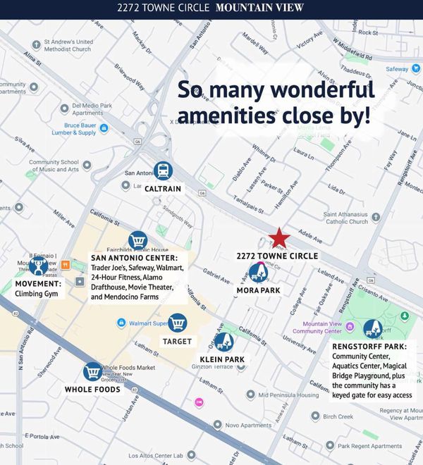 Well-positioned within the Ryland Towne Court community, this stylish three-bedroom, three-bath townhome offers exceptional privacy with no neighbors directly in front or behind, only one shared wall, and views of the greenbelt, playground, and Western Hills. A gated front courtyard and covered entry lead to a tiled foyer with high ceilings, while the lower level features a flexible bedroom or office, full bath, and laundry closet with built-in cabinetry. Upstairs, the light-filled main living areas feature wood floors, a spacious living room with a wall of windows, and a glass door opening to a rear-facing balcony. The kitchen is well-appointed with granite countertops, full-height backsplashes, rich wood cabinetry, tall pantry storage, and quality appliances, and flows seamlessly into the open dining area. The primary suite enjoys park views, a walk-in closet, and an en suite bath with marble finishes and a separate commode room. Enjoy beautifully maintained grounds with a large lawn area just outside your front door, playground, picnic space, car wash area, and private gated access to nearby Rengstorff Park with its new swim complex and Magical Bridge playground. Steps from San Antonio Center, Caltrain, and close to downtown Mountain View, commute routes, and tech employers.