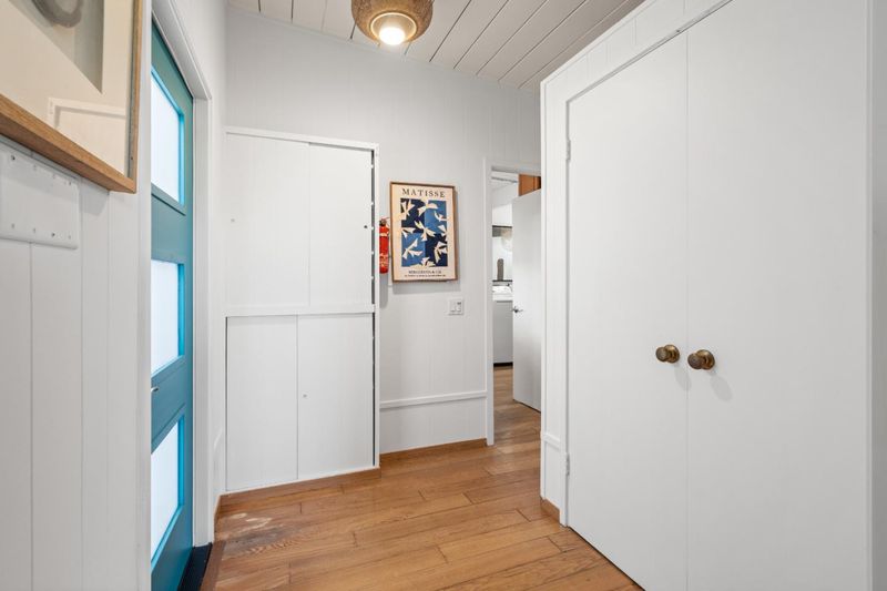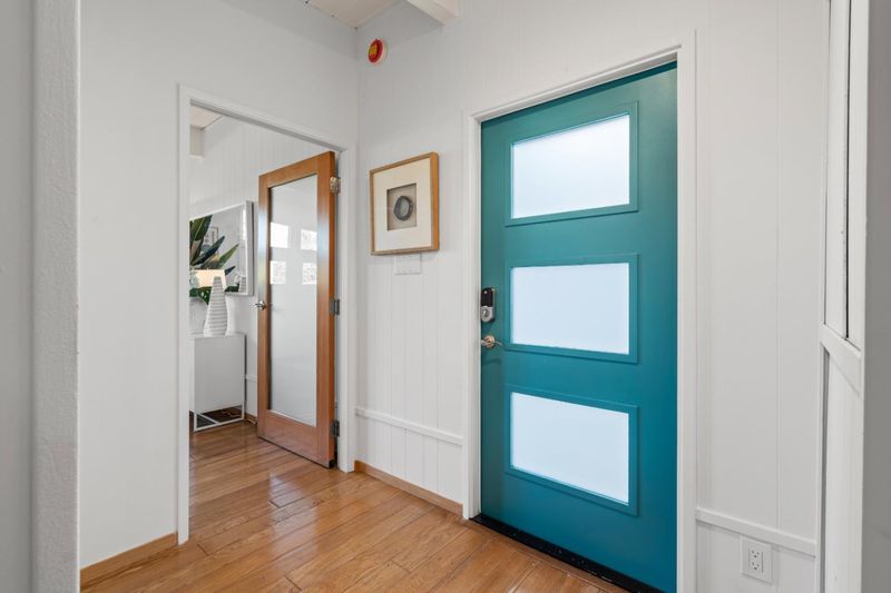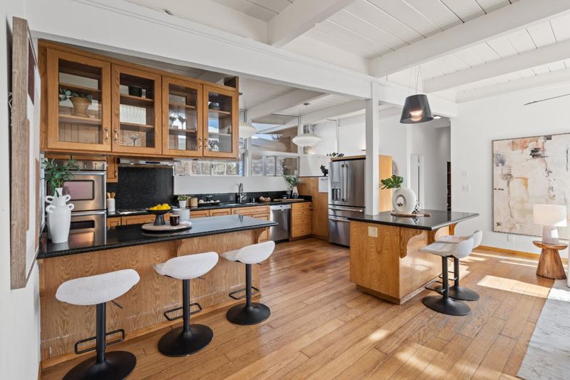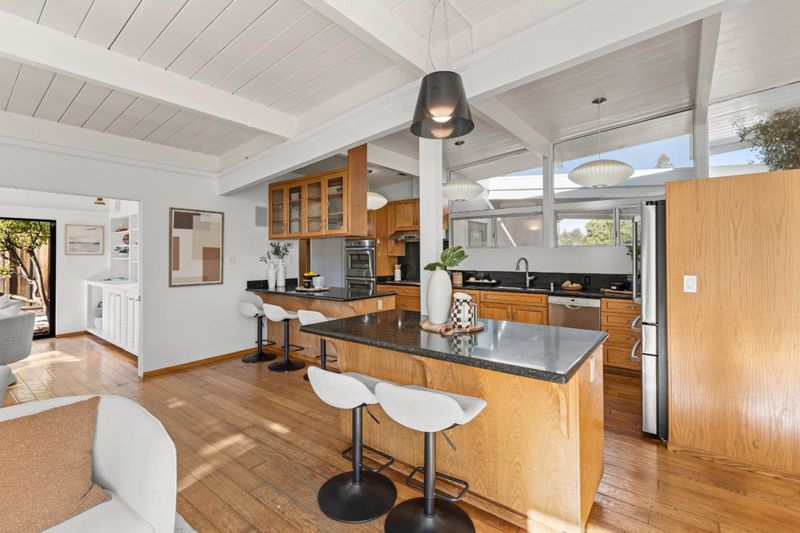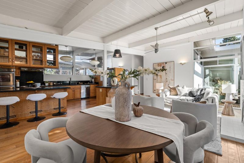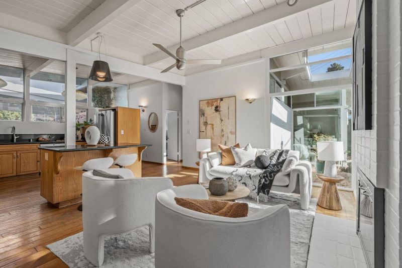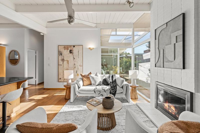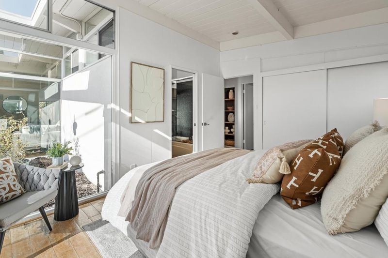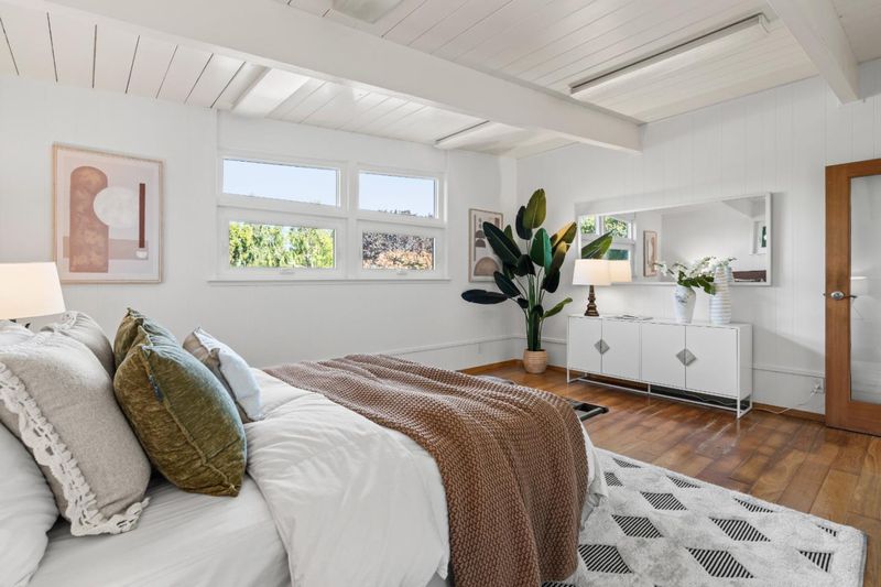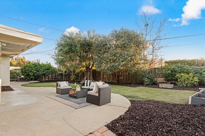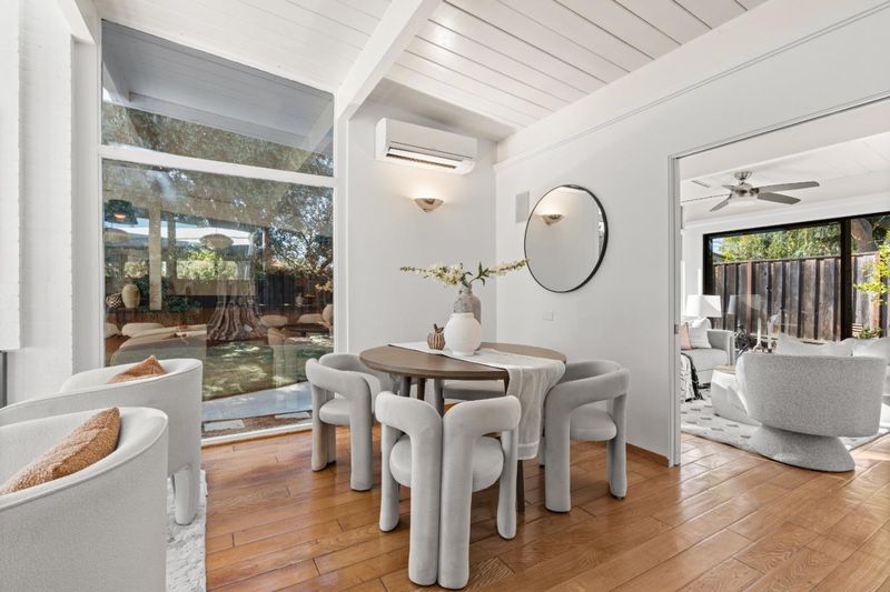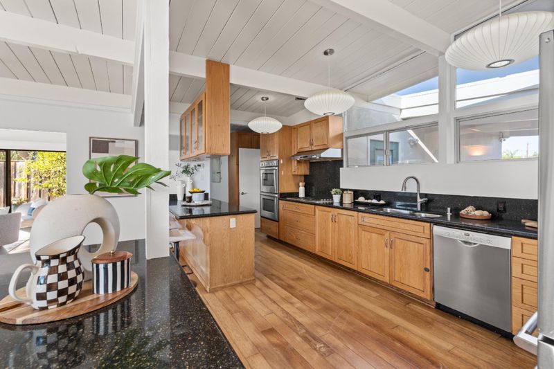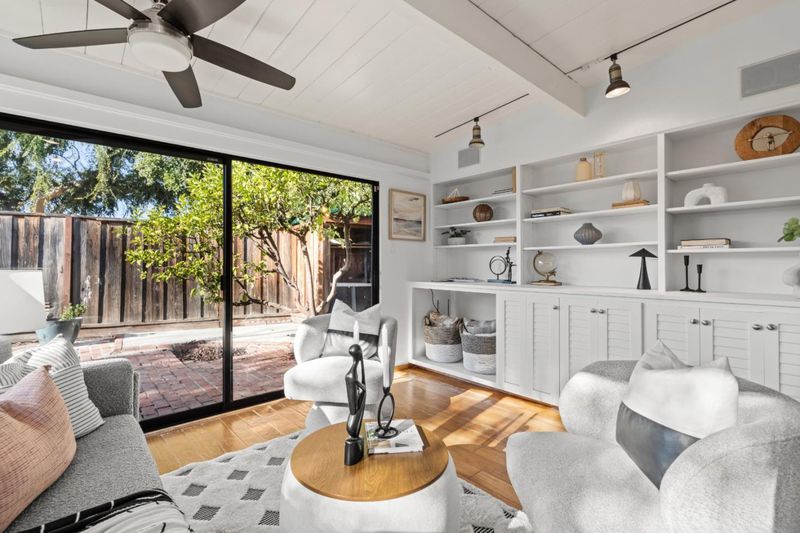 Tucked at the end of a quiet cul-de-sac on a generous ~8k sq ft lot, this bright Mid-Century Modern gem offers space, flexibility, and privacy; featuring 4 BD, 3 full BA, & a potential 5th BD. One of the suites has a separate entrance, ideal for guests, extended family, or a home office. The open layout showcases vaulted beam ceilings, hardwood flooring, & oversized windows for natural light. The living room features floor-to-ceiling windows & a classic fireplace, while the family room includes custom built-ins and sliding glass doors that open to the expansive backyard. The kitchen blends natural wood cabinetry with sleek black countertops, stainless steel appliances, and abundant prep space. The primary suite opens to the backyard through elegant sliding doors, creating a private retreat. One of the bedrooms with separate entrance, ADU potential. The low maintenance backyard features lush artificial turf and a variety of fruit trees for year round harvest. Additional highlights include a newer foam roof, AC heat pump for heating and cooling, solar panels, backup water heater, and EV charging. Located within walking distance to top-rated schools, parks, and the library, with easy access to downtown Palo Alto, Mountain View, Stanford, Caltrain, and major tech campuses.