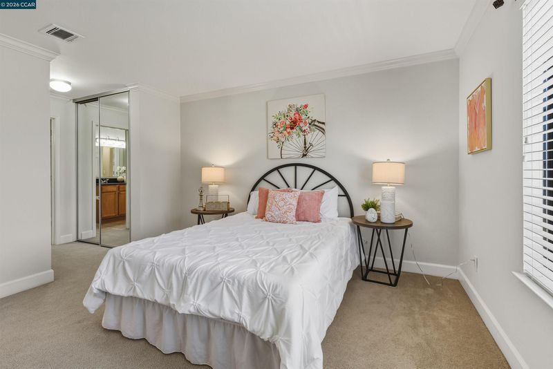 Beautifully maintained Eastridge upper-level condo at the top of San Ramon's Bollinger Canyon Rd. Gated community within a mile of City Center, year-round farmers market, The Marketplace shops, restaurants, Central Park, library, community ctr, Iron Horse Trail. 1074+/-SF. 2 bds w/en suite bathrooms, mirrored closet drs. 2 bathrooms w/single sink vanities, tub/shower combos. Inviting entry. Vaulted ceilings. Fresh int paint. Crown molding. Tile & carpeted floors. Updated central AC (2019). Abundant natural light. Living rm w/wood-burning fireplace, slider to view balcony & storage closet. Dining area, ceiling fan/light. WOW!!