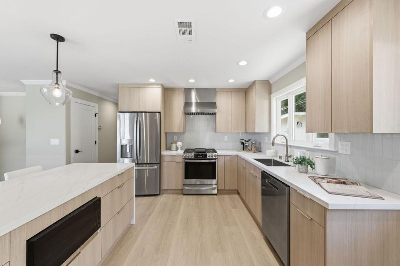 - Cooktop - Gas, Countertop - Quartz, Dishwasher, Exhaust Fan, Garbage Disposal, Hood Over Range, Microwave, Oven Range - Built-In, Gas, Refrigerator