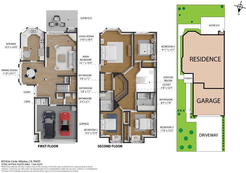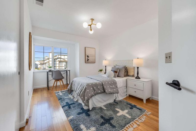 853 Erie Circle, well-appointed 4 beds, 2.5 baths, 1860 sf, 2-story home on a 2760 sf lot in Milpitas' Hidden Lake Village. Double-entry doors open into a spacious living room, anchored by a fireplace, where sliding glass doors lead to a patio seating area. A wet bar, positioned near the living and dining areas, adds functionality. Large windows frame the dining area, flooding it with natural light. New LVP flooring on the first floor and hardwood floors flow throughout the upper main living spaces. Updated kitchen features granite countertops and backsplash, oven range with hood, refrigerator, dishwasher, and recessed lighting. A breakfast nook offers a perfect spot for coffee or casual meals. The main level also has a powder room and direct access to a two-car garage. Upstairs, the spacious primary suite serves as a retreat with double vanities, updated designer lighting, drop-in tub, and walk-in closet. The hallway bath features dual vanities, designer lighting, and shower-tub combo. Three additional bedrooms with built-in closets provide flexible space. The fenced backyard is designed for easy maintenance and includes a fruit-bearing tree. This well-crafted home is situated near top-rated schools, local parks, hiking trails, shopping centers, and everyday conveniences.