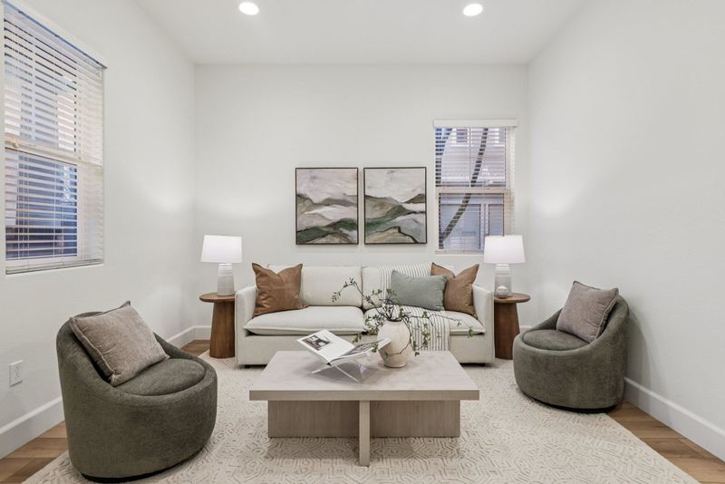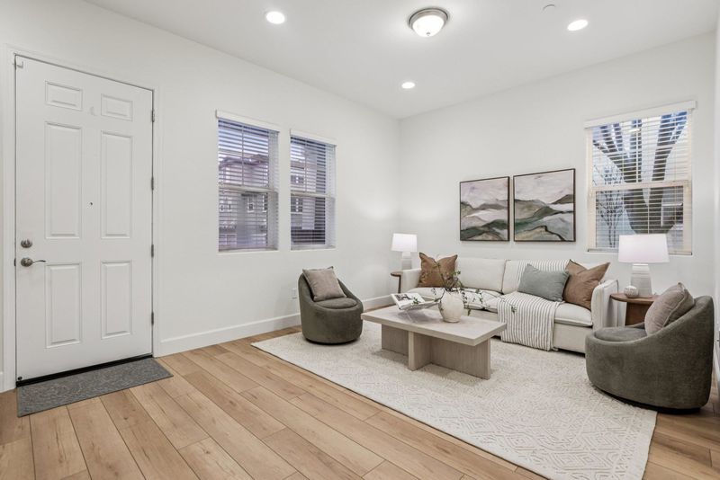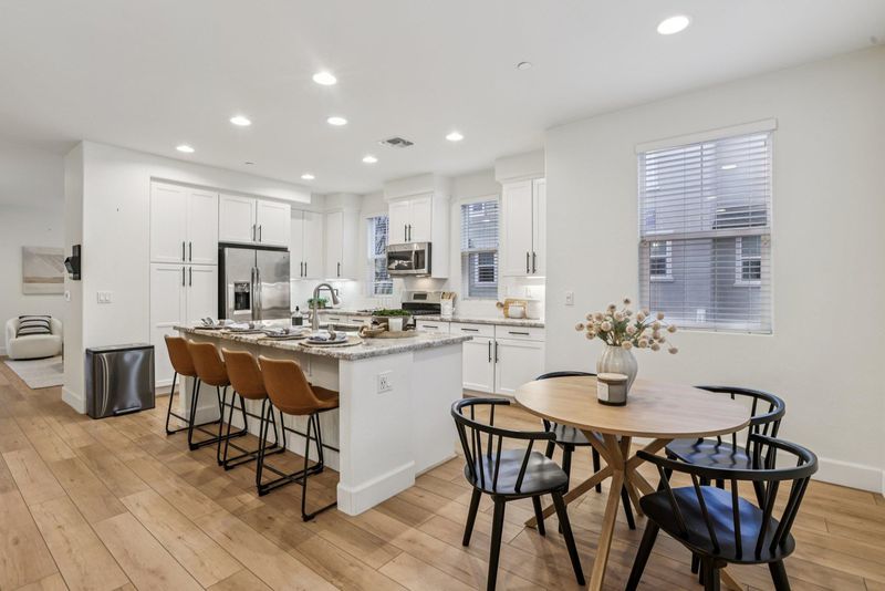 Welcome to 3933 Portola Commons, a bright, move-in-ready corner-unit townhome with 3 bedrooms, 2 full bathrooms, and 2 half bathrooms across three well-designed levels. The entry level features a light-filled living room, half bath, and direct access to an oversized two-car garage. This flexible space offers potential to convert into a fourth bedroom or home office. The second floor showcases an open-concept layout with a modern kitchen featuring white shaker cabinets, stainless steel appliances, oversized island, and LVP flooring, flowing into the dining and family rooms. A half bath off the main living area and a balcony off the family room provide added convenience and outdoor enjoyment. Upstairs includes three bedrooms, a laundry room, and a spacious primary suite with walk-in closet and en-suite bath, while two additional bedrooms share a Jack-and-Jill bathroom. Additional highlights include a tankless water heater, ample storage, guest parking nearby, and a community offering green space and a park. Ready for you to call home today!