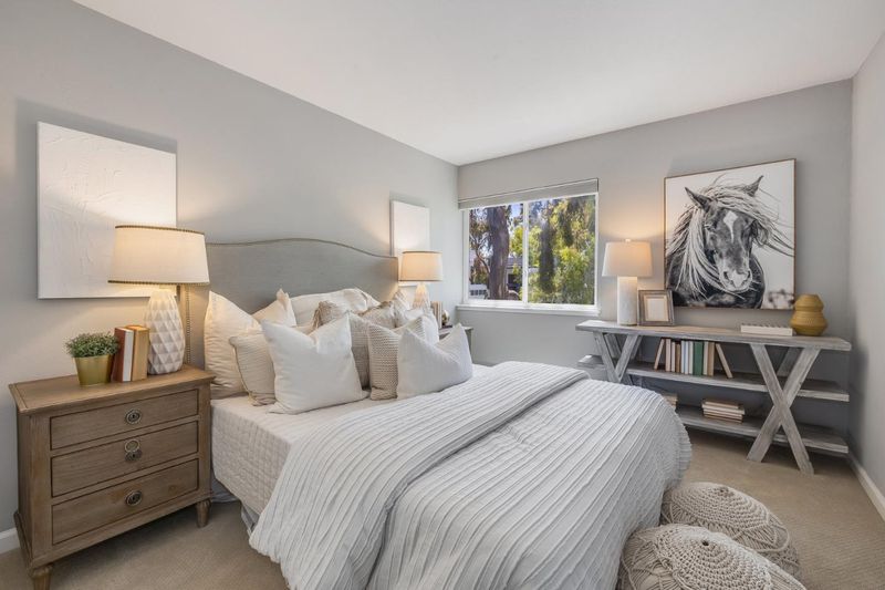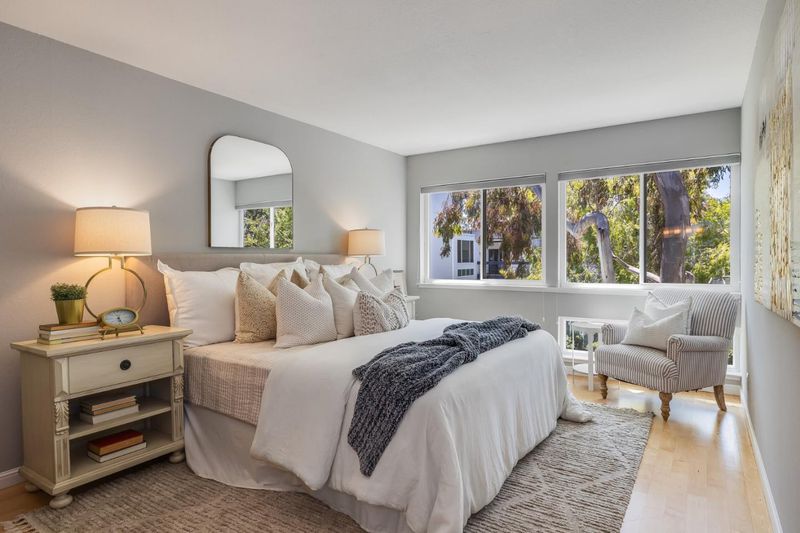 Top floor penthouse-style living awaits in this refined and well-appointed 3BR/2BA corner unit. Ideally positioned near the elevator and stairs, this approximately 1,288 SF residence is enhanced by expansive double-pane windows that flood the interior with dramatic natural light, showcasing engineered floors, crown molding, and new designer paint. The formal entry features a coat closet and leads to a spacious living room, anchored by a classic fireplace and access to an exclusive balcony, while seamlessly flowing into a dining area framed by a stunning wall of glass. Bright and functional, the eat-in kitchen boasts generous food prep space, sleek modern countertops, crisp white cabinetry, and stainless-steel appliances. Conveniently located, a full-sized laundry room features enviable cabinetry for storage. Down the hall, the private primary suite offers serenity with a generous walk-in closet and a beautifully remodeled ensuite bath. Two additional bedrooms, an updated hall bath, and an expansive storage closet complete the floor plan. Residents enjoy resort-style amenities including a pool, spa, fitness center, and clubhouse, a covered parking space, and plentiful guest parking. Offering access to top-rated schools and walkability to the Bay Trail!
