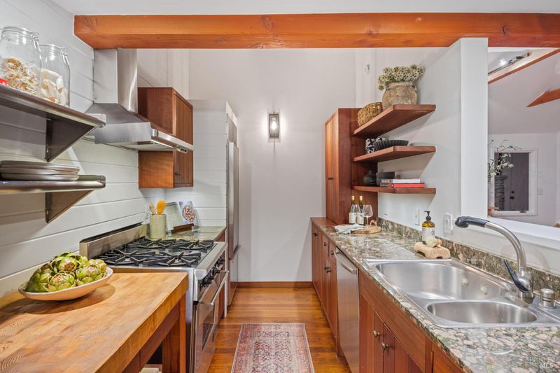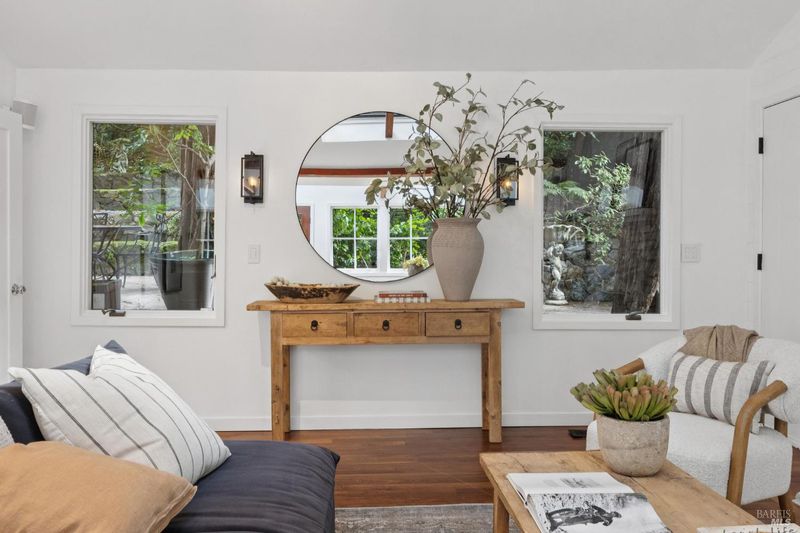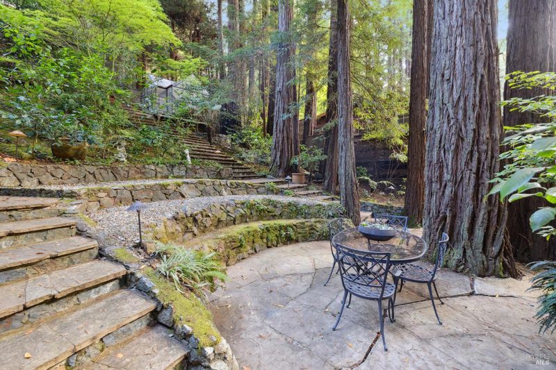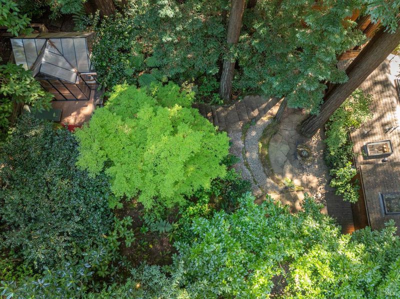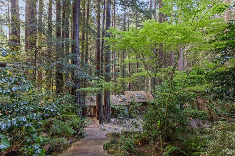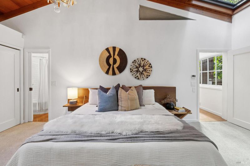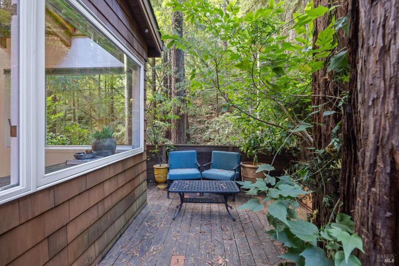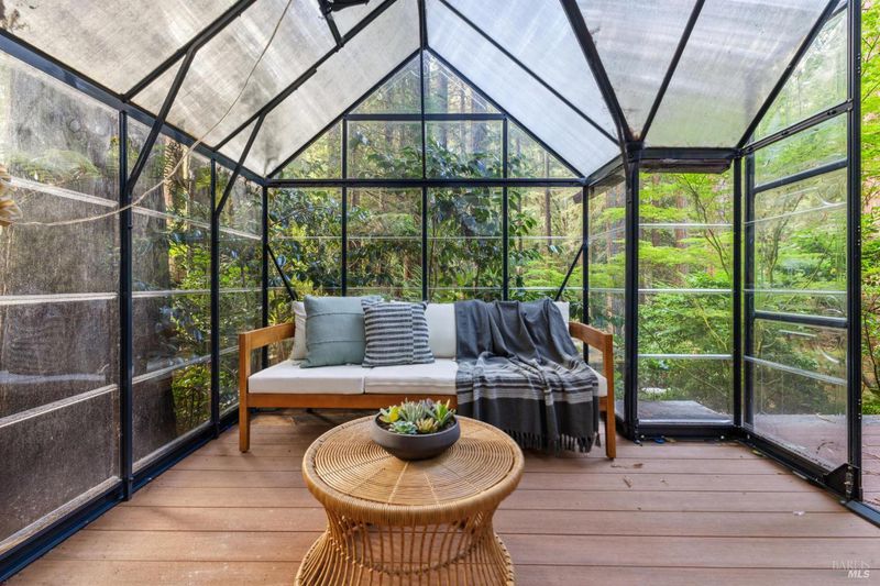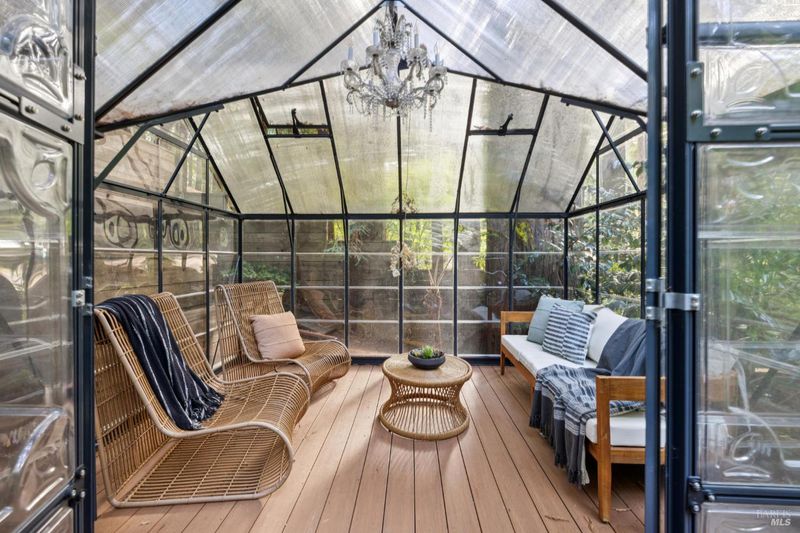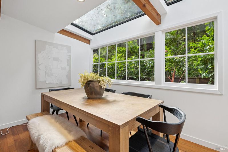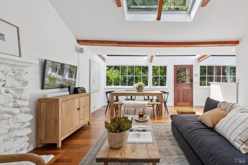 Tucked away beneath a canopy of majestic redwoods, this thoughtfully designed Mill Valley home blends modern sophistication with rustic charm. Sunlight pours through expansive skylights and picture windows, creating a seamless connection between the indoors and surrounding nature. The living room features vaulted ceilings with exposed beams, wide-plank hardwood floors, and a striking whitewashed stone fireplace as its centerpiece. The open-concept dining area is framed by walls of glass and skylights with views of lush greenery just beyond. The kitchen features custom cabinetry, stone counters, high-grade appliances, and open shelving that balances style and function. The spacious primary suite has soaring wood-clad ceilings, an elegant chandelier, and private access to the outdoors. Additional highlights include a guest bedroom, flexible spaces, and the home's showpiece: a greenhouse-style lounge perfect for gathering, relaxing, or simply soaking in the natural surroundings. The outdoor spaces are equally picturesque with multiple decks, potted gardens, and intimate seating areas surrounded by nature. This home offers the ideal balance of retreat and connection, tucked away in privacy yet just moments from downtown Mill Valley.