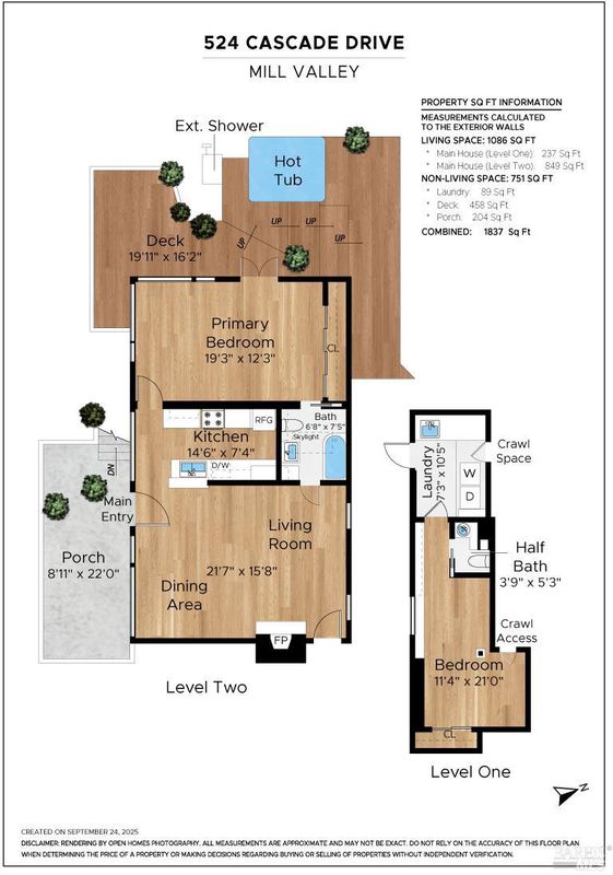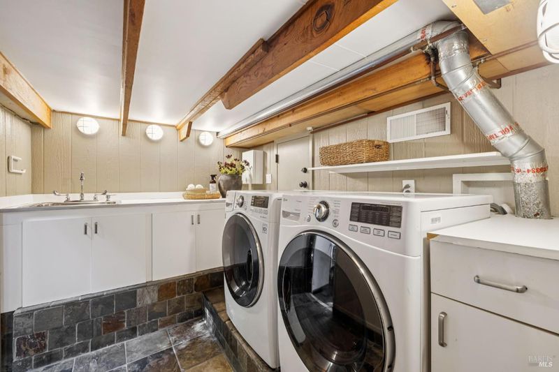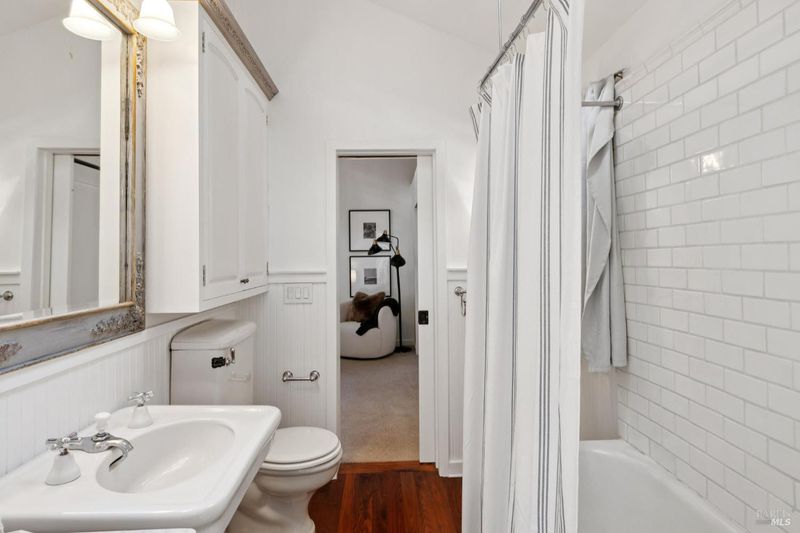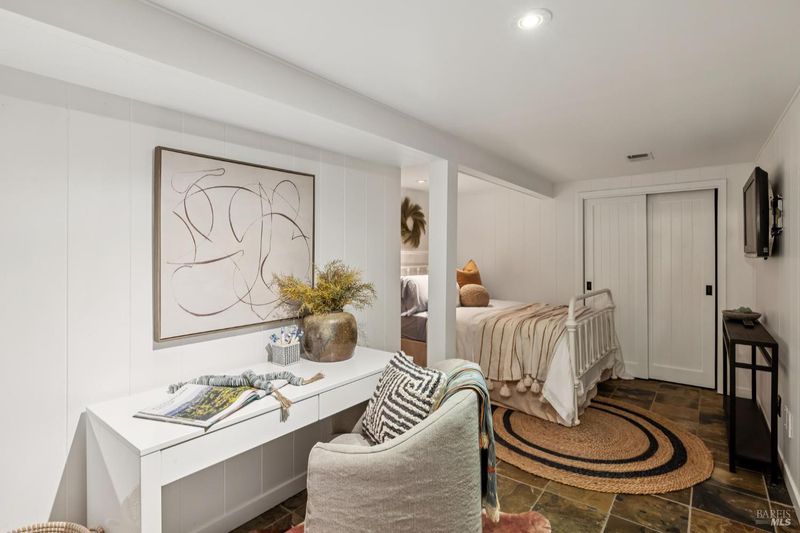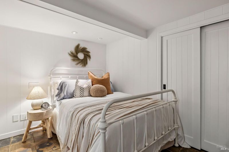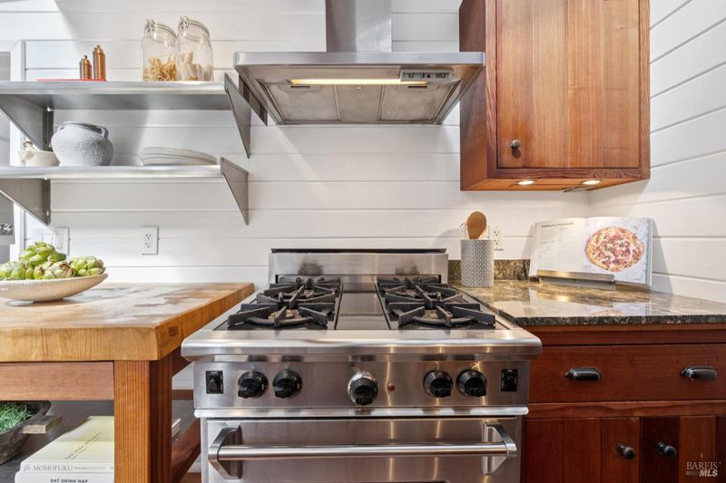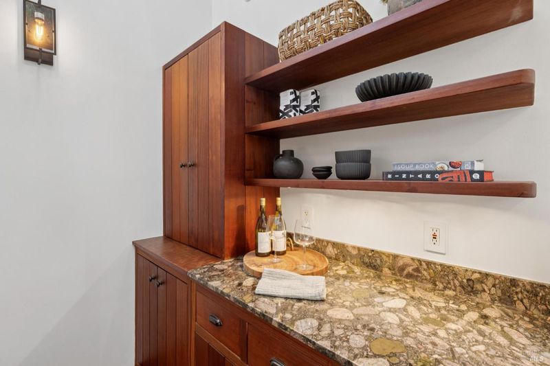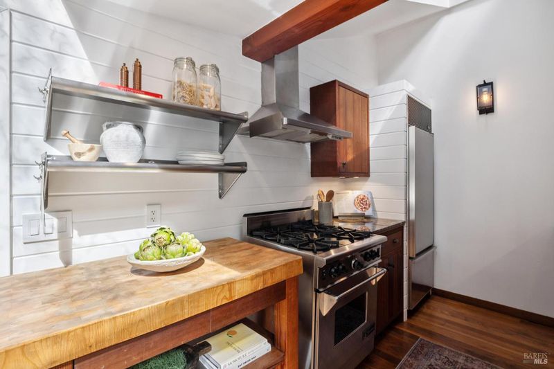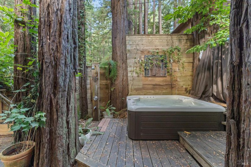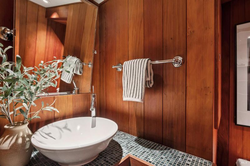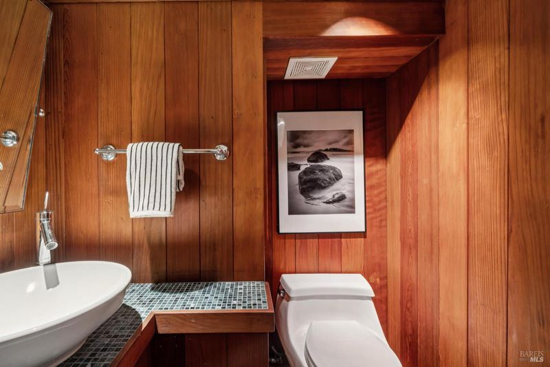 Tucked away beneath a canopy of majestic redwoods, this thoughtfully designed Mill Valley home blends modern sophistication with rustic charm. Sunlight pours through expansive skylights and picture windows, creating a seamless connection between the indoors and surrounding nature. The living room features vaulted ceilings with exposed beams, wide-plank hardwood floors, and a striking whitewashed stone fireplace as its centerpiece. The open-concept dining area is framed by walls of glass and skylights with views of lush greenery just beyond. The kitchen features custom cabinetry, stone counters, high-grade appliances, and open shelving that balances style and function. The spacious primary suite has soaring wood-clad ceilings, an elegant chandelier, and private access to the outdoors. Additional highlights include a guest bedroom, flexible spaces, and the home's showpiece: a greenhouse-style lounge perfect for gathering, relaxing, or simply soaking in the natural surroundings. The outdoor spaces are equally picturesque with multiple decks, potted gardens, and intimate seating areas surrounded by nature. This home offers the ideal balance of retreat and connection, tucked away in privacy yet just moments from downtown Mill Valley.