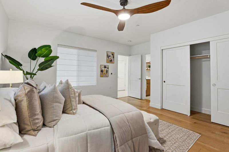 This stunning 4-bedroom, 3.5-bath home offers 2,857 sq ft of thoughtfully designed living space in the sought-after Boulevard community. An elegant entry leads to a ground-floor bedroom with en-suite bath and access to a tranquil Zen garden. The gourmet chefs kitchen features a large island, BOSCH appliances, a smart refrigerator, and premium cabinet organizers. Spacious living and dining areas include a versatile retreat extension ideal for a home office or flex space. Two balconies enhance indoor-outdoor living, complemented by wall-to-wall wood flooring throughout. The luxurious primary suite includes an oversized shower, freestanding tub, and large walk-in closet. Two additional bedrooms, a double-vanity bath, and an organized laundry room with Electrolux washer/dryer complete the upper level. Additional highlights include a two-car garage with EV charging, a 21 cu. ft. freezer, and a fully paid solar system with backup battery. Enjoy resort-style amenities including a pool, gym, clubhouse, parks, and recreation areas. Convenient access to BART, I-580/680, shopping, and top-rated schools. Walk to the new K8 school opening Fall 2026.