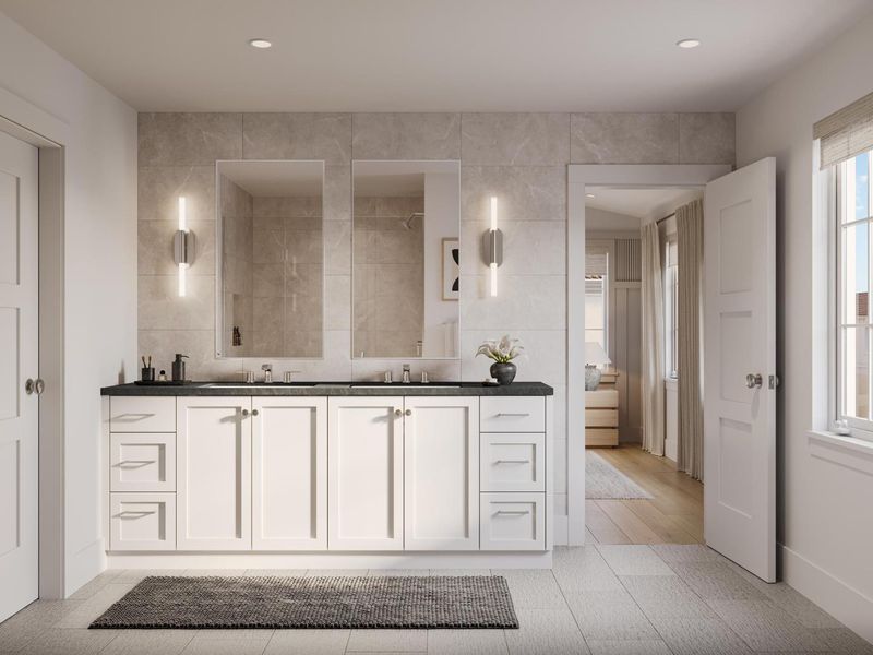 - Double Sinks, Full on Ground Floor, Marble, Primary - Stall Shower(s), Shower and Tub, Solid Surface, Stall Shower