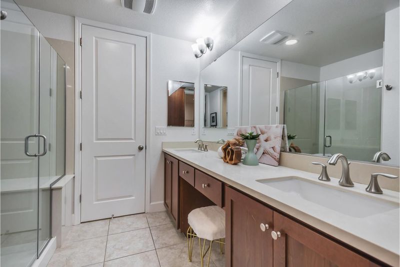 - Double Sinks, Full on Ground Floor, Primary - Stall Shower(s), Showers over Tubs - 2+, Solid Surface, Stall Shower, Tile