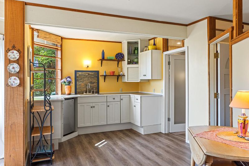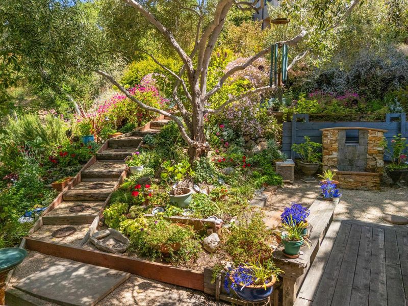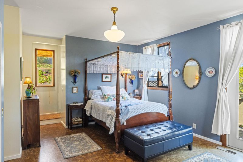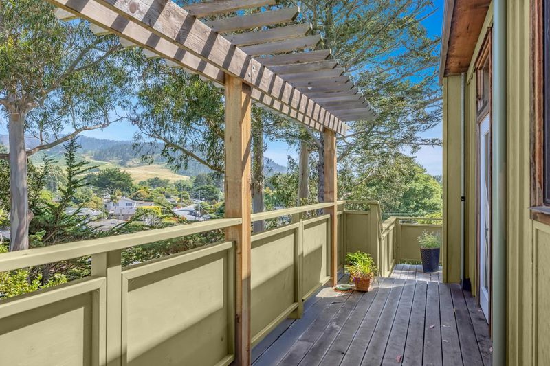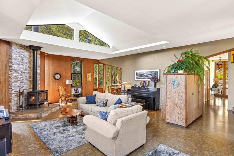 Mid-century redwood home on a Carmel hillside with views, sunlit interiors, and terraced gardens. Main level offers 2 bedrooms and 1.5 baths; below, a separate permitted studio with 1 bath and private entrance, minutes from Carmel-by-the-Sea beaches, dining, and trails. Set among terraced gardens and soft coastal light, this distinctive mid-century home captures the essence of Carmel's creative landscape. Built in the mid 1960s from locally sourced redwood, its design was inspired by Frank Lloyd Wright's Usonian principles. Clerestory and intentionally symmetrical windows plus tall glass doors frame the surrounding landscape as living art. The main level offers about 1,528 sq ft of airy living space with decks overlooking colorful, seasonally blooming gardens. Below, the permitted studio's flexible 510 sq ft layout with full bathroom makes an ideal guest suite, office, or artistic retreat. Lovingly cared for by one family since new, the property blends architecture, nature, and creative spirit in an exceptional location near white sand beaches.