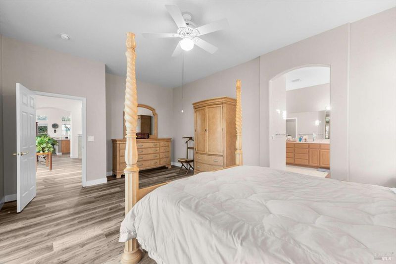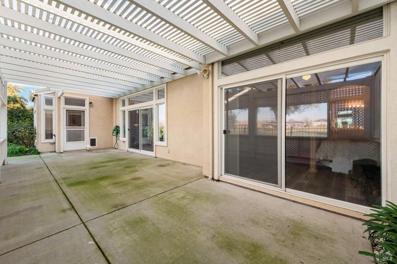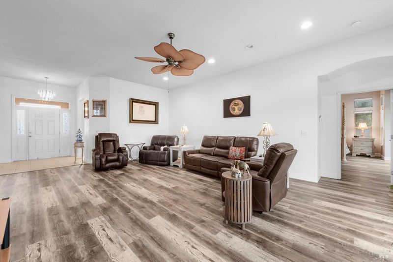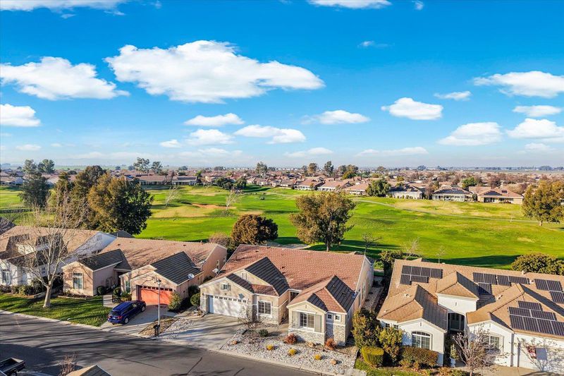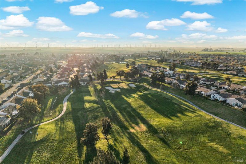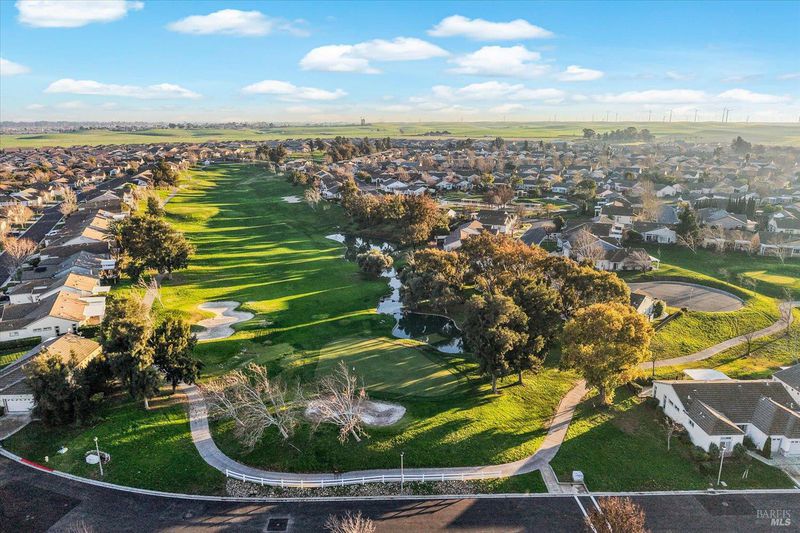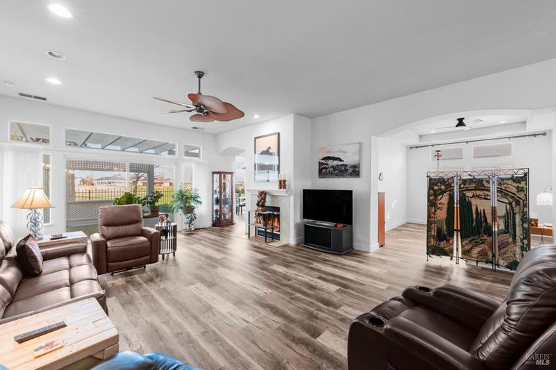 One of the largest, 2325 sq ft, Islander model offers so many nicely upgraded interiors with a rare 3 bedroom, 3 bath home on a premium golf course lot with gorgeous 16th fairway views from its huge glassed-in back patio. Features include new stylish laminate flooring with tile flooring in the entry and baths, a formal dining room. A private den, office, sewing room (use your imagination!) with double doors and a full wall of built-in cabinetry with a desk, an elegant fireplace in the living room. for those cold winter nites. The kitchen features delightful Corian countertops, under cabinet lighting, double ovens, a gas cooktop, and a large breakfast room with golf course views from the bay window. The Master Suite has its own slider to the back patio, and a luxurious bathroom with soaking tub, a roomy shower with bench seat, huge fully mirrored dual sink vanity, and a big walk-in closet with extensive organizers. Guests will enjoy their own private & comfortable bedroom with it's own private bathroom & closet.The third bedroom has mirrored closet doors & plenty of room. Enjoy the golf course views on the large enclosed back patio with glassed-in wind and privacy screens in a fully fenced back yard. Roomy 2 car garage includes extensive custom storage cabinetry and plugs for your EV vehicles. Trilogy offers a club house with activities, tennis & pickleball courts, golf, a delightful restaurant & plenty of friends. Trilogy is a 55+ active adult community.