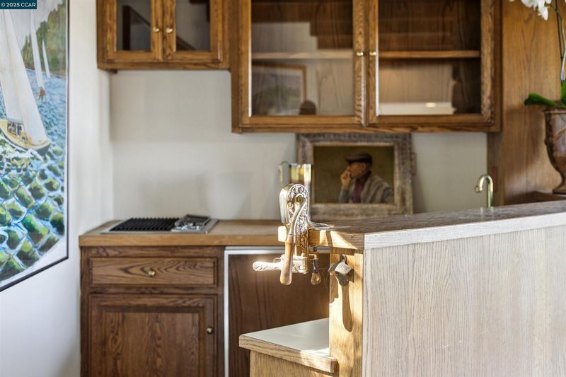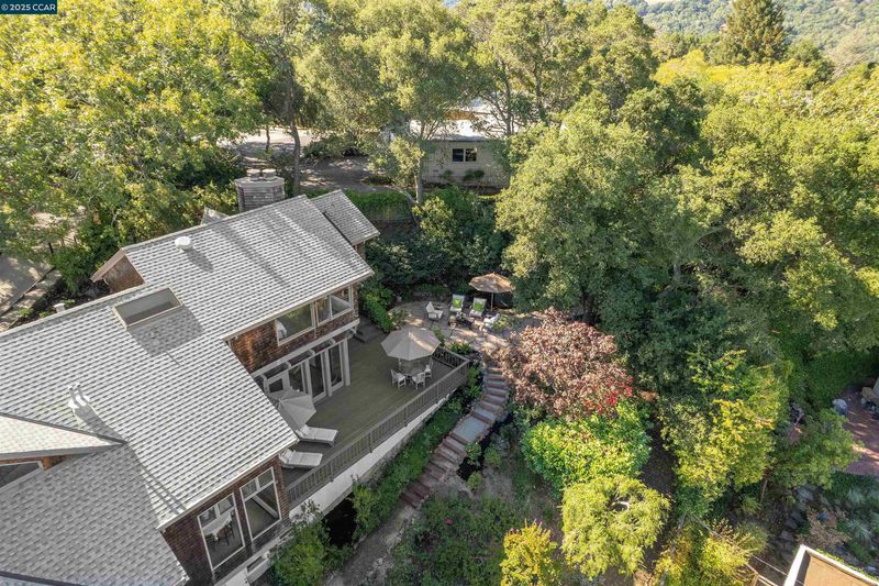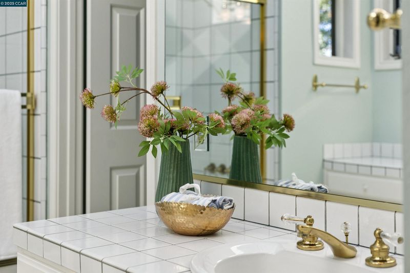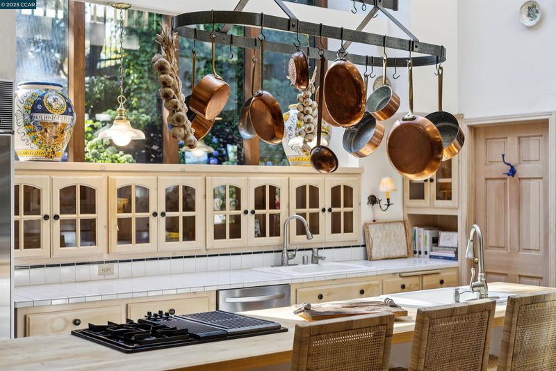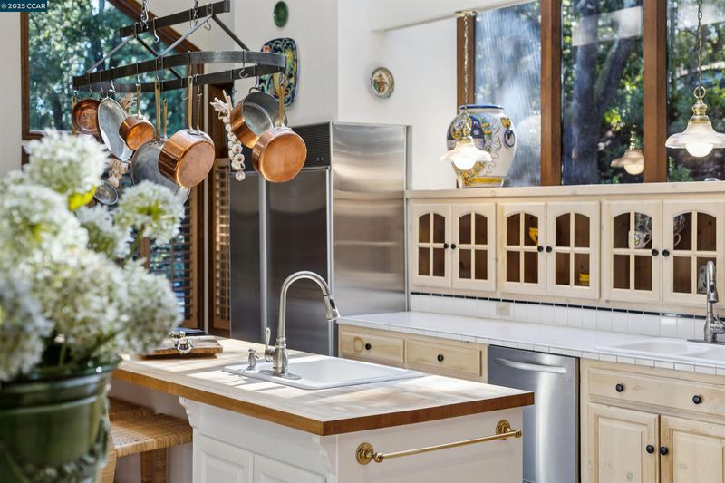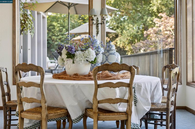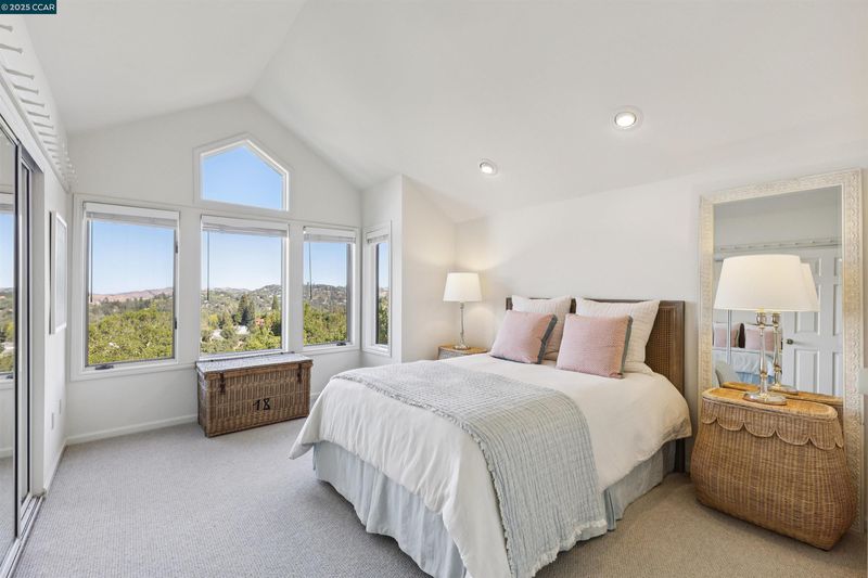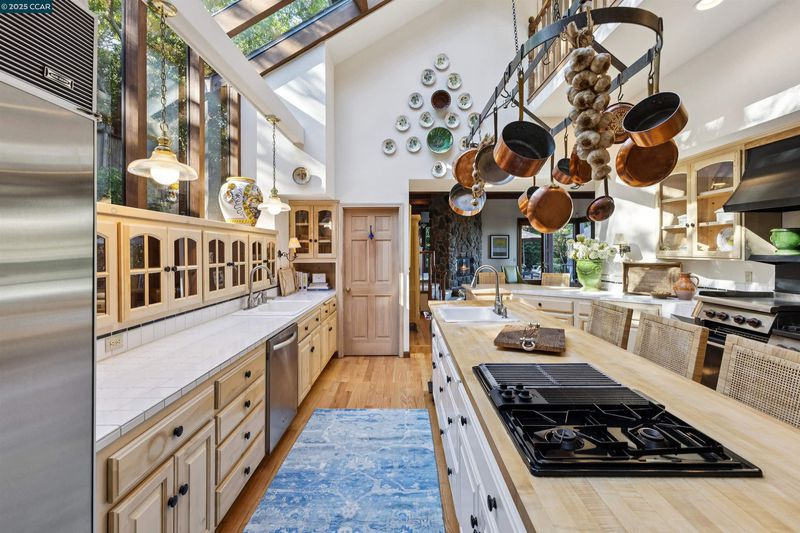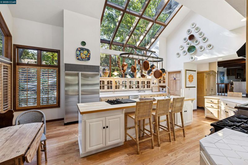 Nestled near the popular Orindawoods community and in the prestigious Orinda Country Club neighborhood, this beautifully appointed home offers a serene retreat with stunning views of the surrounding hills. As you enter, you’re welcomed by soaring ceilings, expansive windows, and a mix of rich hardwood floors and wool carpeting that immediately set a tone of understated luxury. Rich wood doors and millwork lend character and warmth throughout the home. A dream kitchen straight out of a Nancy Meyers movie sets the tone for this home’s heart and soul. Bathed in natural light pouring through a vaulted ceiling and dramatic skylight, the space is as charming as it is practical—a chef’s delight— equipped with professional-appliances and plenty of room to create. Just off the kitchen, the family room invites relaxation with its floor-to-ceiling rock fireplace and direct access to the backyard. A few steps away, an elevated pub-style bar offers a handsome setting for entertaining. A room meant for gathering—the formal dining room is a showstopper, with 17' ceilings and dramatic picture windows that flood the space with natural light. Outside, the grounds feel lush and alive. Mature vegetation surrounds you—citrus trees, hydrangeas, roses, and more—framing every path and corner in green.