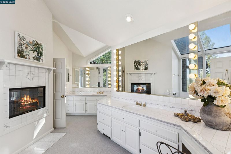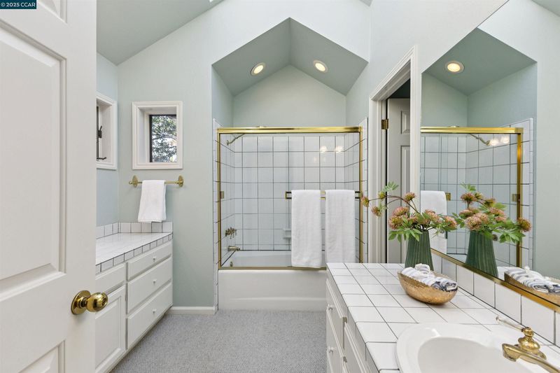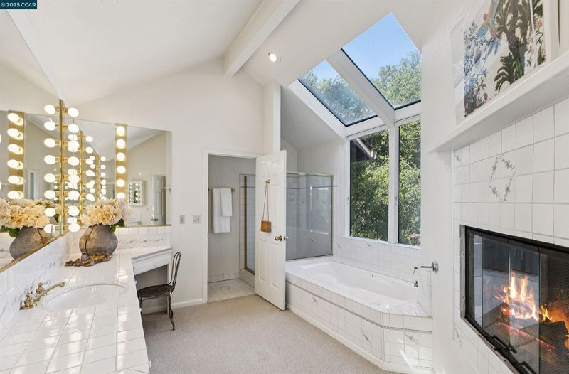 - Shower Over Tub, Skylight(s), Solid Surface, Stall Shower, Tile, Tub, Updated Baths, Double Vanity, Stone, Window