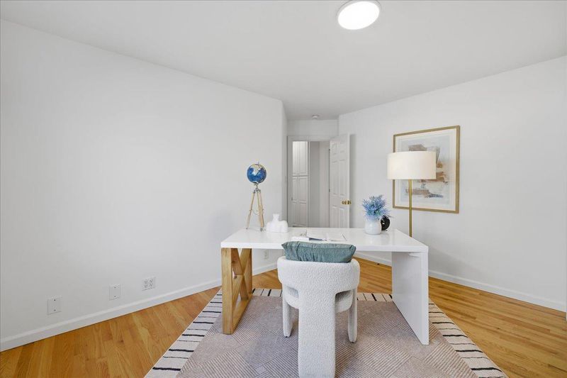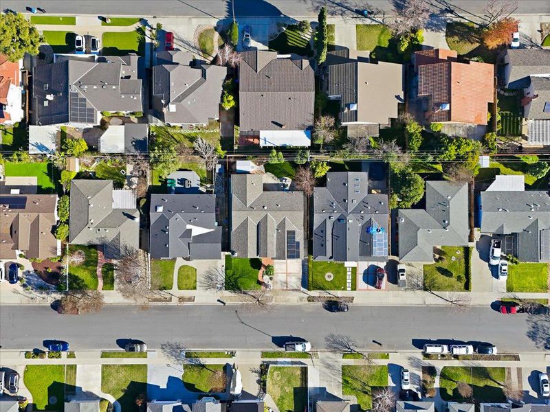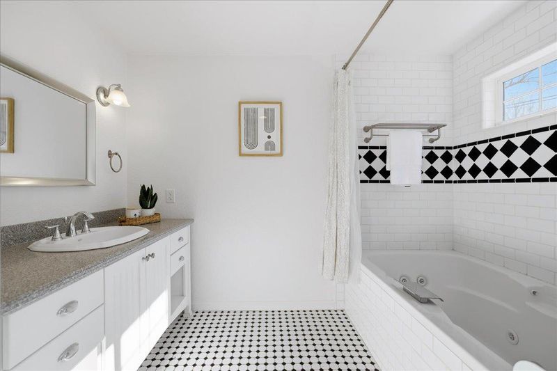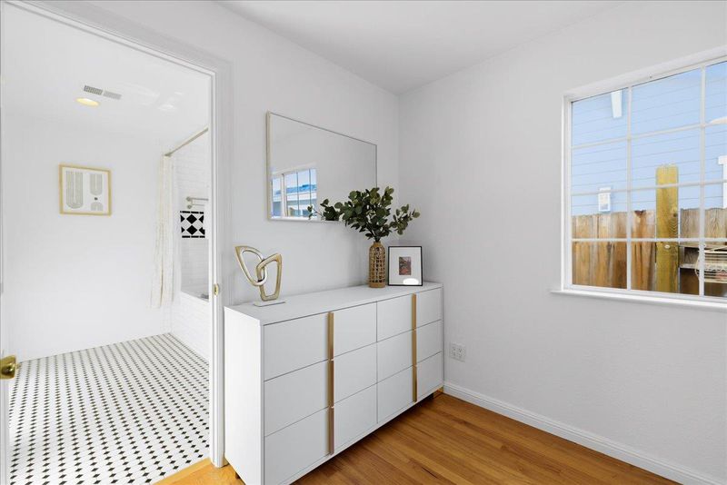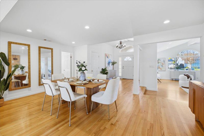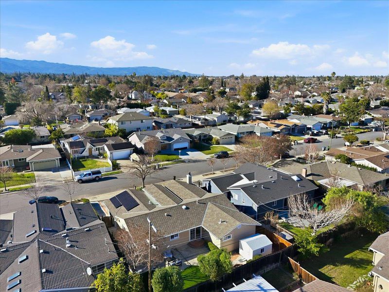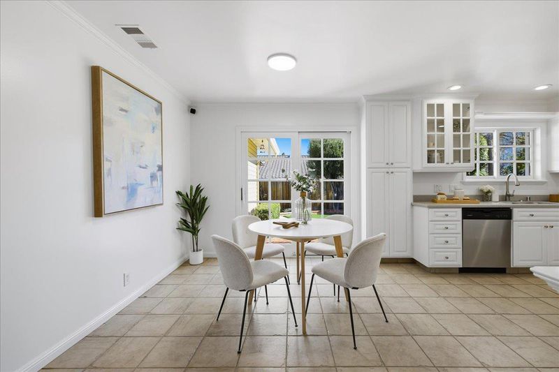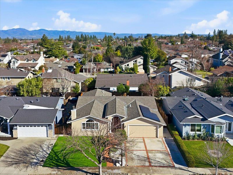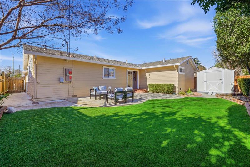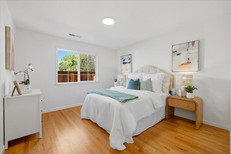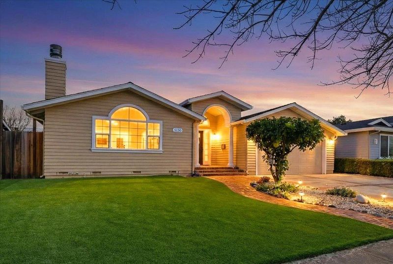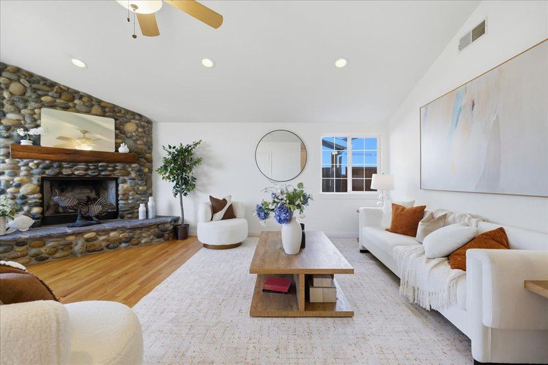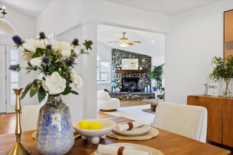 Top-rated school. Radiating warmth and sophistication, this immaculate single-story residence in the heart of San Jose captivates with soaring vaulted ceilings and a dramatic stone fireplace that serves as the living rooms focal point. Sunlight streams through the grand arched window, illuminating the refinished hardwood floors that flow seamlessly throughout the open concept layout. The chefs kitchen is both functional and stylish, featuring crisp white cabinetry, glass front display accents, and a bright window overlooking the side grounds. Designed for indoor outdoor living, the dining area opens through sliding glass doors to a private backyard retreat with a concrete patio and lush lawn, perfect for weekend entertaining or quiet relaxation. The primary suite offers a true sanctuary with a remodeled spa inspired bathroom featuring a deep jetted tub and modern vanity. Additional highlights include recessed lighting, a versatile home office space, updated fixtures throughout, and owned solar panels for energy efficiency and long term savings. Tucked away on a quiet street yet moments from Whole Foods, Costco, and major commute routes, this home is also served by the highly rated Union School District and Alta Vista Elementary.