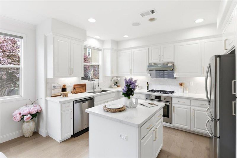 Beautiful end-unit townhome by Toll Brothers, perfectly positioned in the heart of Silicon Valley near major tech campuses. This bright and stylish Sunnyvale residence offers approximately 1,650 sq ft of thoughtfully designed living space with 3 bedrooms and 2.5 baths. Step into a light-filled living area highlighted by dramatic 13-foot ceilings and elegant front-facing windows, creating an inviting and airy ambiance. The open-concept family and dining area flows seamlessly into a beautifully upgraded chefs kitchen featuring stainless steel appliances, a Fotile range hood, gas range, and a generous island with sleek quartz countertopsperfect for entertaining and everyday living. Upstairs, unwind in spacious bedrooms, including a serene primary suite with vaulted ceilings and a spa-inspired bath complete with dual sinks, soaking tub, and separate shower. Convenient in-home laundry enhances comfort and ease. Enjoy the vibrant lifestyle with a short stroll to Seven Seas Park, and quick access to Sunnyvale Baylands Park, Levi's Stadium, and Shoreline Amphitheatre. With easy access to Highways 237, 101, and 85 and proximity to Apple, Google, Microsoft, Amazon, Meta, and LinkedIn, this is a home you wont want to miss.