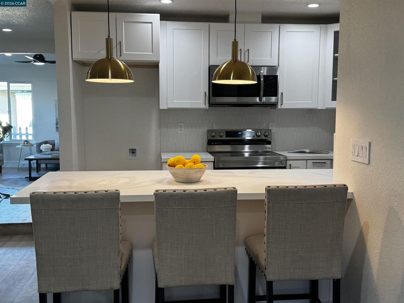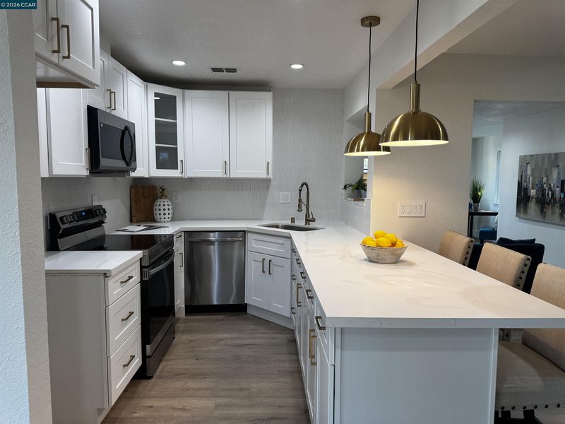 - Dishwasher, Electric Range, Microwave, Gas Water Heater, Stone Counters, Eat-in Kitchen, Electric Range/Cooktop, Disposal, Updated Kitchen