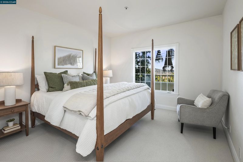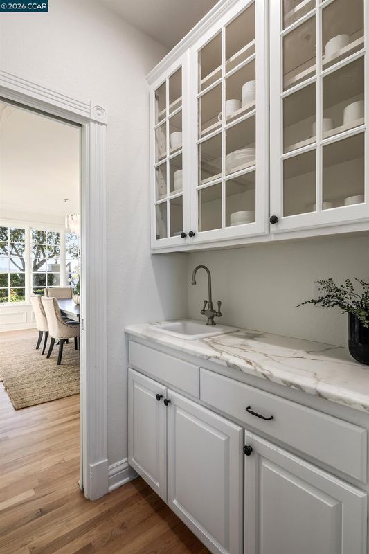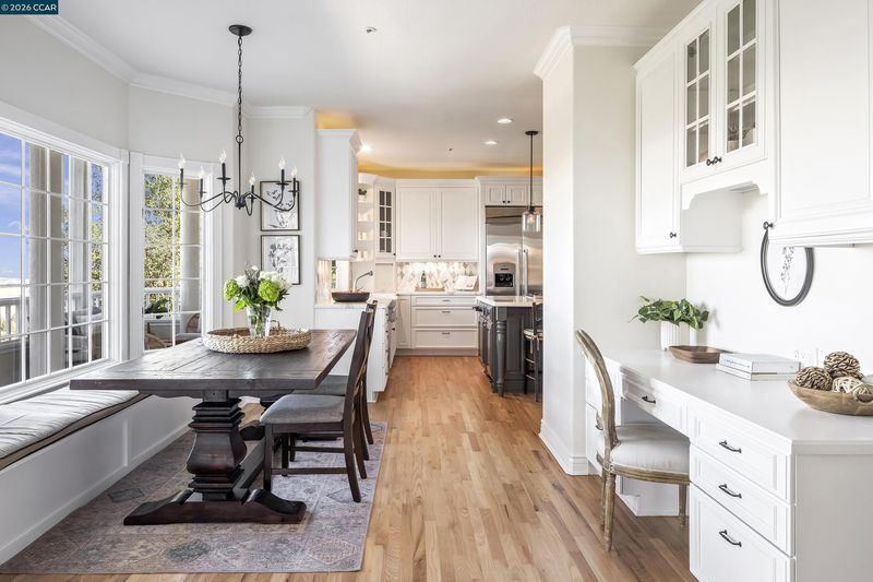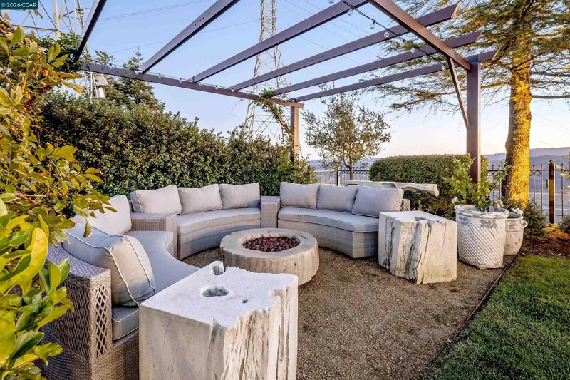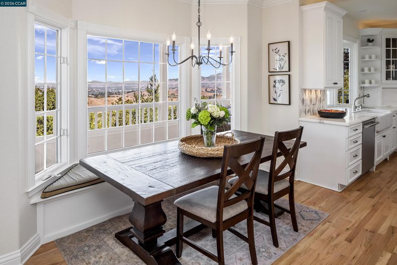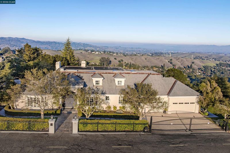Perched atop the Orinda Oaks Open Space Preserve, this estate offers sweeping views of Mt. Diablo and the Berkeley hills. Mature oaks, Japanese maples, wisteria, lavender, roses, and other lush foliage flank the home. Step inside the foyer beneath 15-foot ceilings. To the left, a 360-sq-ft living room sits under a coffered ceiling; to the right, the dining room accommodates 10-12 with garden views. The kitchen features a large island with bar seating, a breakfast nook nestled into a bay window, 2 ovens, 2 sinks, 2 dishwashers, and ample counter space. Adjoining the kitchen, the family room spans more than 360 sq ft and includes a full wet bar. A 240-sq-ft office and large wraparound patio offer inspiring views—including glimpses of SF Bay. Four bedrooms are on the lower level, including a private guest/in-law suite or exercise room. The 460-sq-ft principal suite upstairs offers a marble fireplace, 2 walk-in closets, a nursery or exercise room, and a luxurious bath with steam shower, jacuzzi tub, sauna, dual vanities, and skylights. Outdoor living is equally distinguished with a covered swimming pool, built-in grill, and pergola-shaded lounge area with a new gas firepit overlooking the Preserve’s natural splendor.