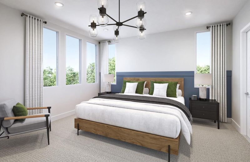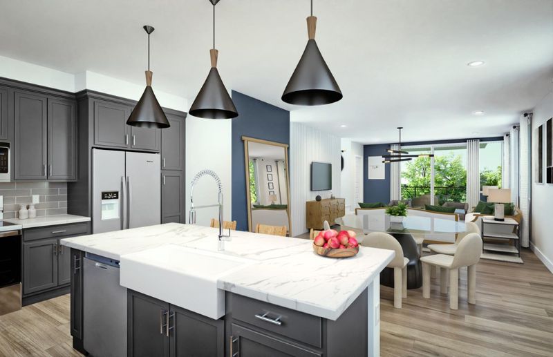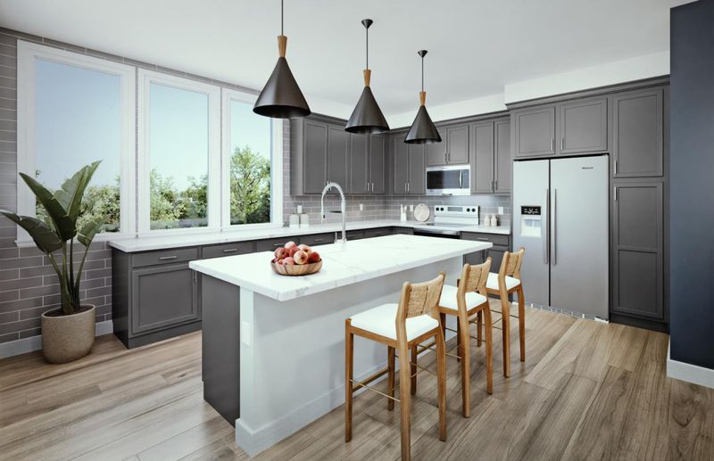 This spacious, fully upgraded Plan D corner home features a gourmet kitchen with upgraded cabinets and countertops, an open floorplan with modern finishes, and a large private deck perfect for entertaining in a bright, stylish setting. Photos are renderings not of actual home.